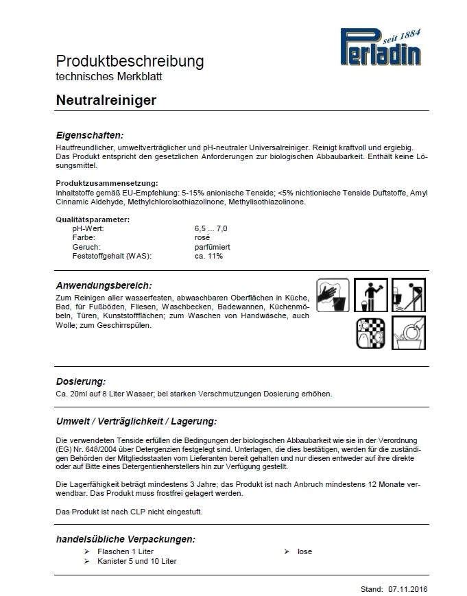 Original Perladin Reinigungsmittel seit 1884 – Neutral-Reiniger – Kanister, tragbar – Inhalt 5 Liter – Universell Einsetzbar – inkl. passendem Ablasshahn/Dosierhahn – Perladin Neutralreiniger ist geeignet für alle abwaschbaren Flächen in Küche, Bad, für Fußböden, Fliesen, Waschbecken, Badewannen, Küchenmöbeln, Türen, Kunststoffflächen; zum Waschen von Handwäsche, auch Wolle; zum Geschirrspülen.